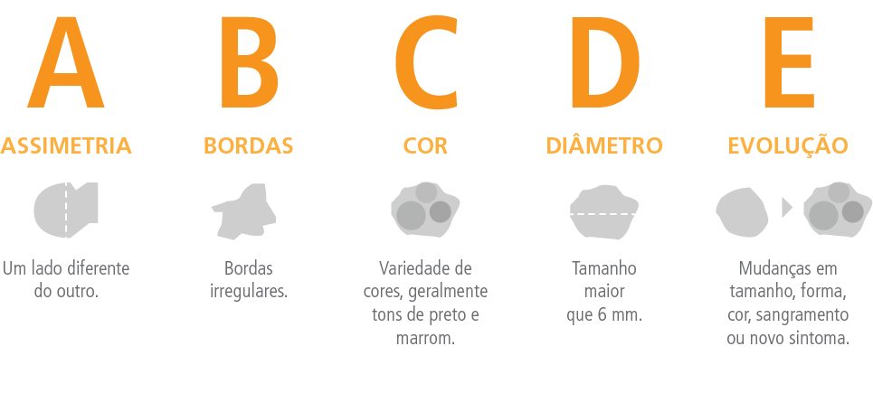 A regra ABCDE auxilia na identificação dos sinais do Melanoma. Observe sua pele, olhe suas pintas, sinais ou uma feridinha que nunca cicatriza, e, ao identificar semelhanças entre sua pinta e as especificações dessa regra, procure um dermatologista o quanto antes.